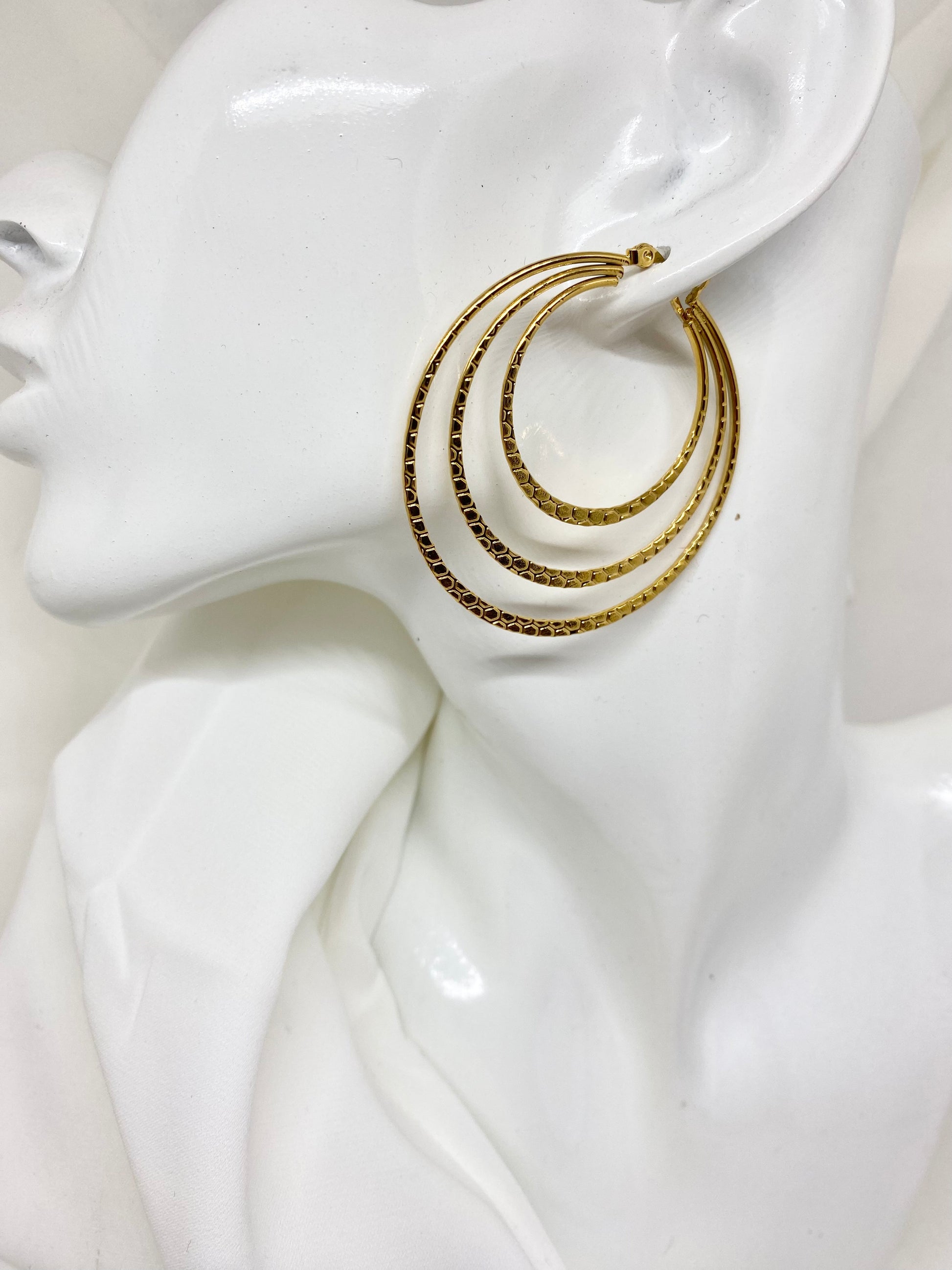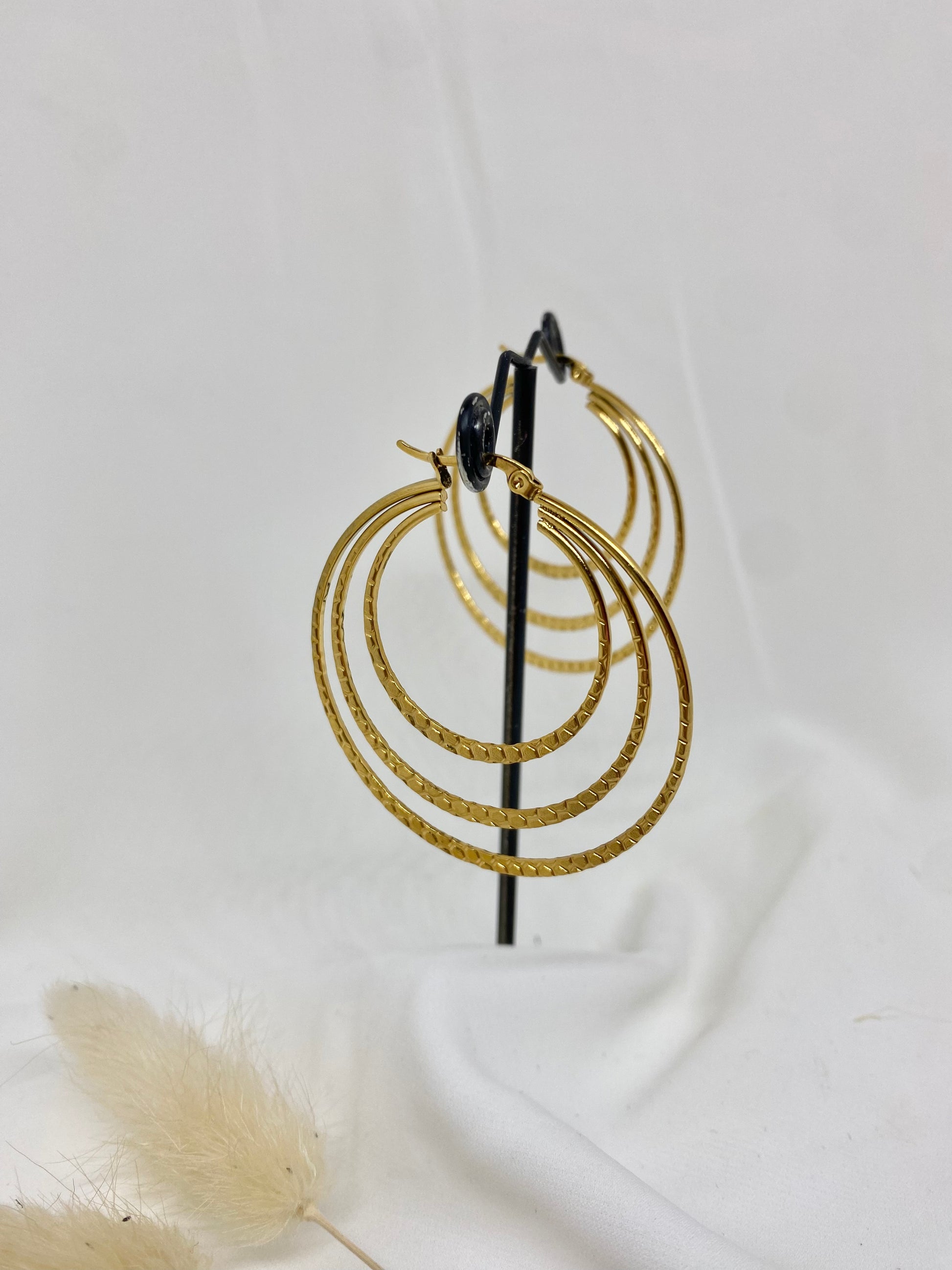 Ces créoles dorées au design unique se distinguent par leurs trois rangs finement ciselés, apportant texture et élégance. Leur forme classique est rehaussée par ce détail subtil, offrant un équilibre parfait entre modernité et raffinement. Un bijou intemporel qui sublime n'importe quelle tenue avec une touche de sophistication.