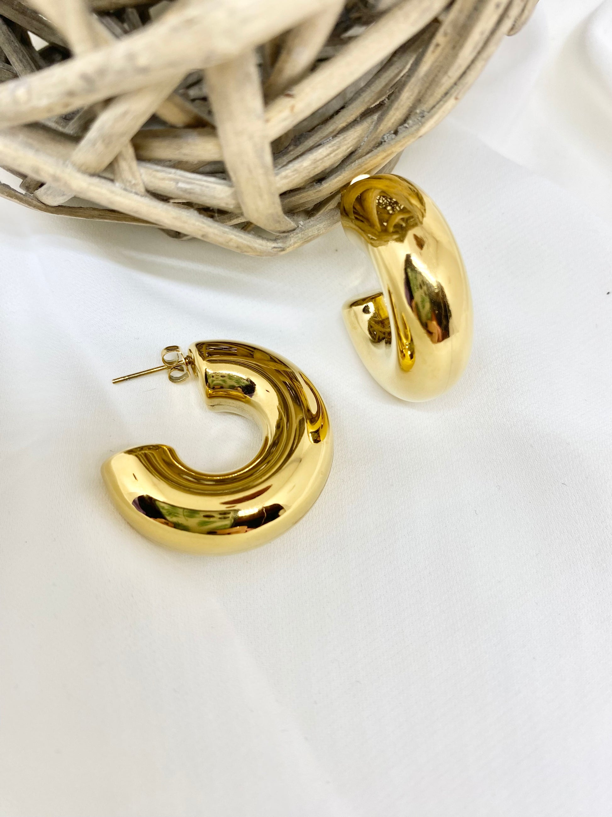 Ces créoles dorées épaises offrent un design simple et moderne, avec une finition lisse qui reflète subtilement la lumière. Leur forme imposante et leur texture épurée apportent une touche de sophistication à n'importe quelle tenue. Un choix parfait pour un look audacieux et élégant, à porter en toute occasion.