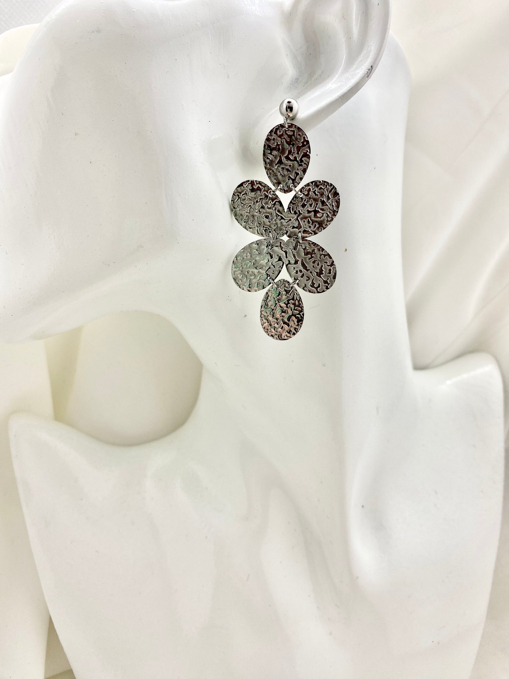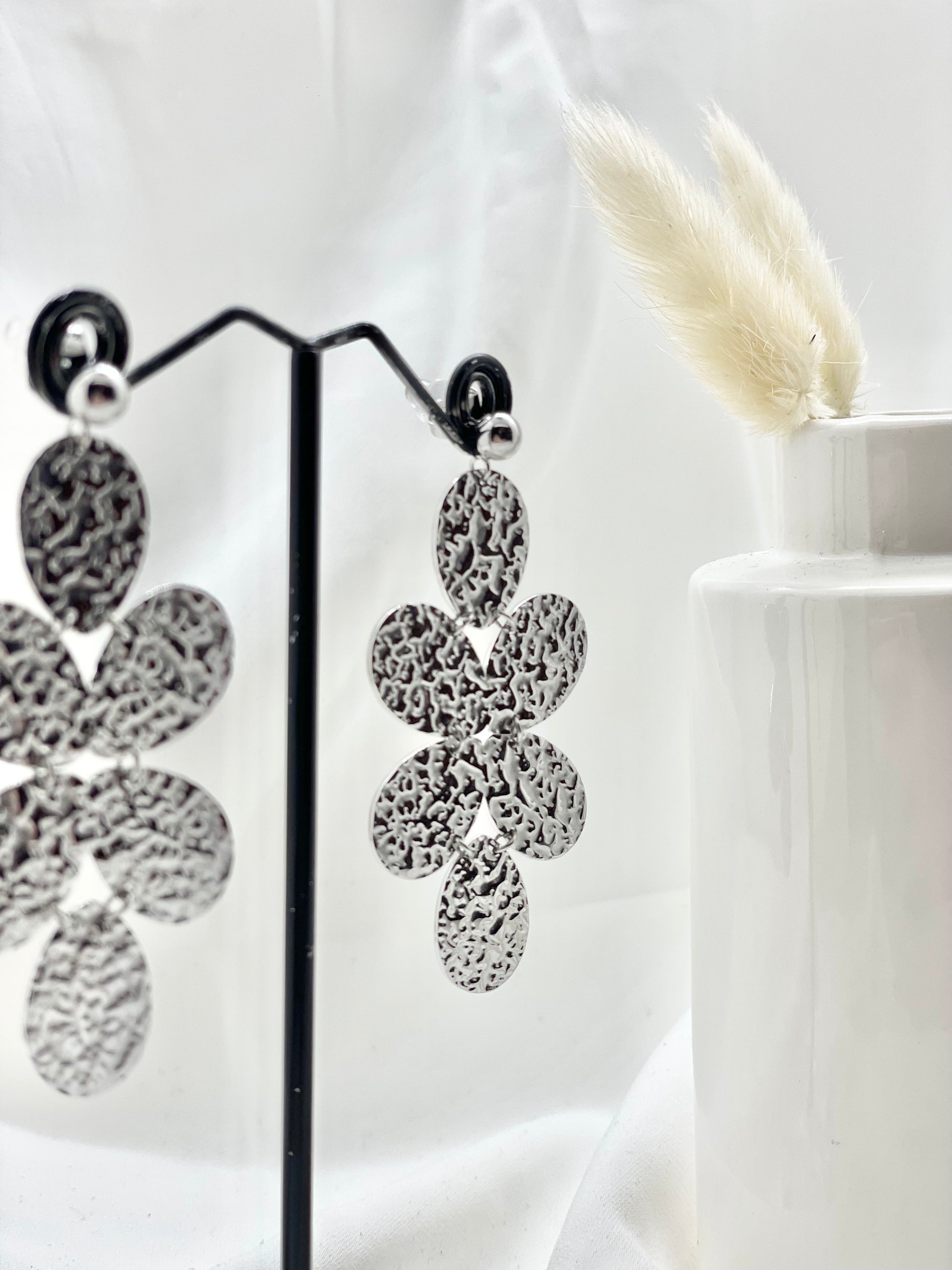 Capturez l'essence de la nature avec notre boucle d'oreille longue au motif délicat de feuille martelée. En argenté, cette pièce apporte une élégance organique à votre look. Légère et gracieuse, elle offre un équilibre parfait entre style bohème et raffinement.