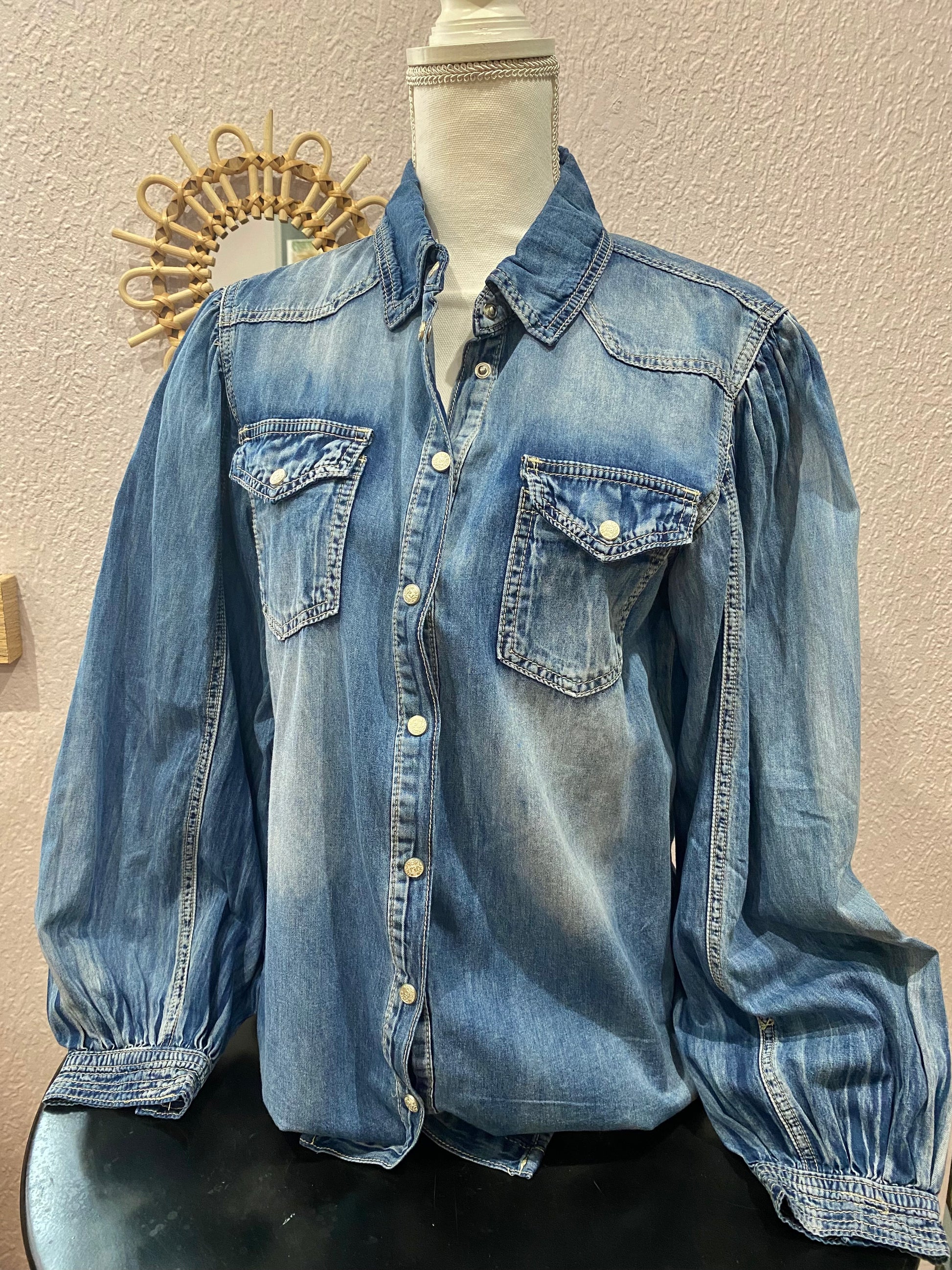 Apportez une touche de style intemporel à votre garde-robe avec cette superbee chemise en jean "PLACE du JOUR". Confectionnée dans un denim bleu légèrement délavé, elle se distingue par ses manches longues bouffantes et ses poignets boutonnés, qui lui confèrent une allure à la fois décontractée et féminine. Dotée d'une fermeture à bouton sur le devant et de deux poches poitrine à rabat, cette chemise allie confort et praticité.