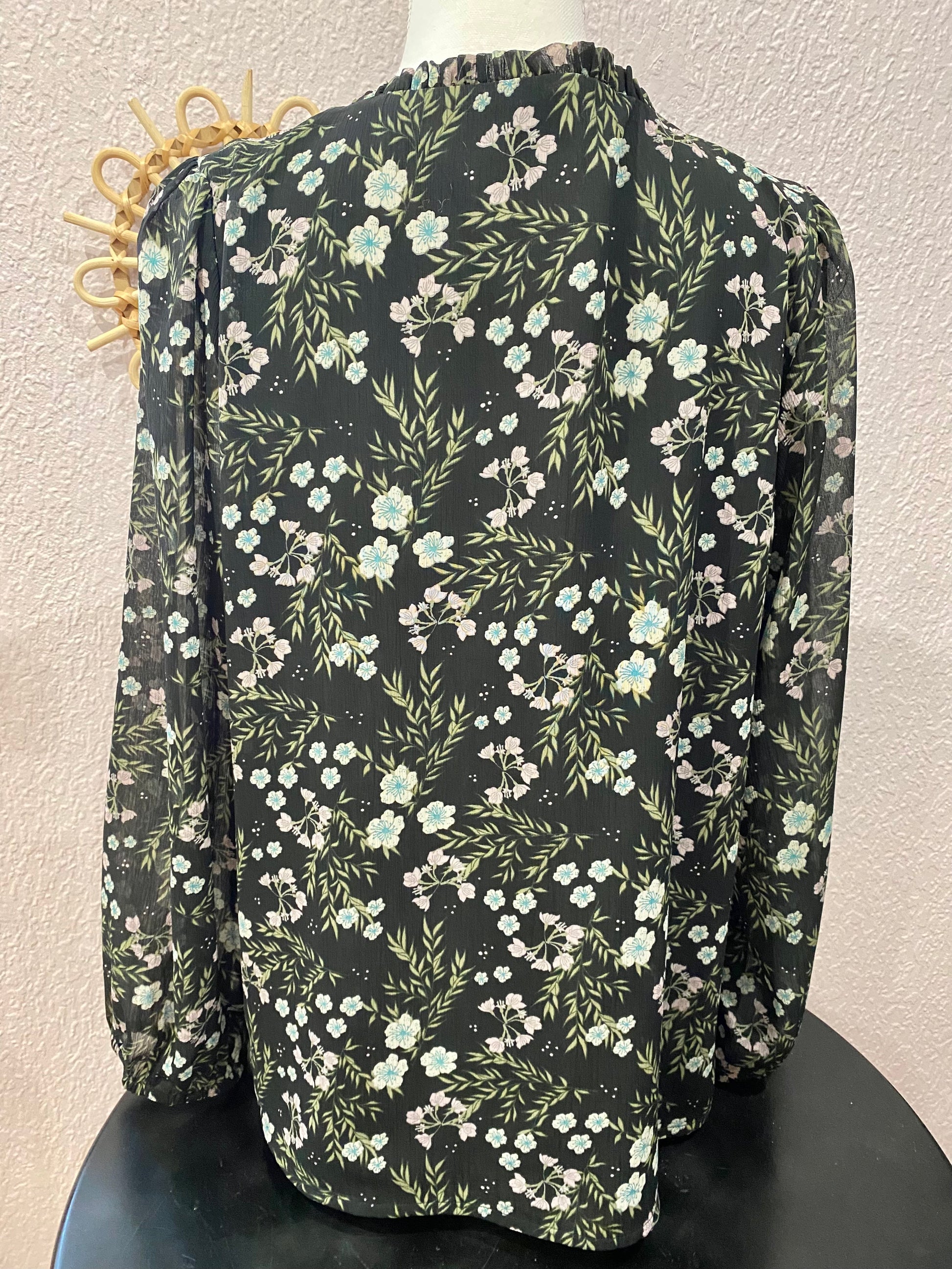 Ce chemisier seconde main à imprimé floral sur fond noir allie légèreté et romantisme. Avec ses manches bouffantes et son encolure froncée, il apporte une touche bohème chic parfaite pour la mi-saison ou un look élégant au quotidien.
