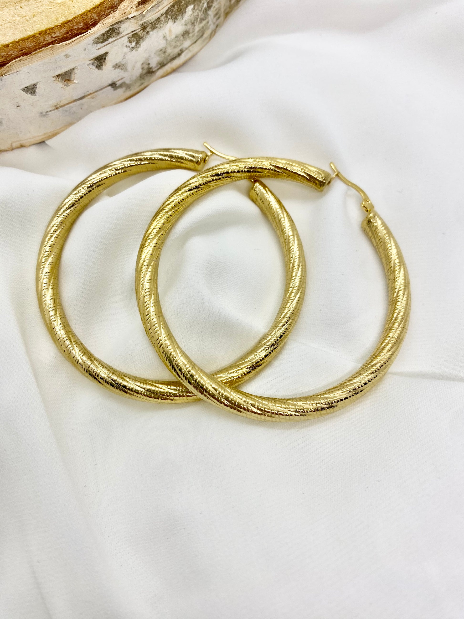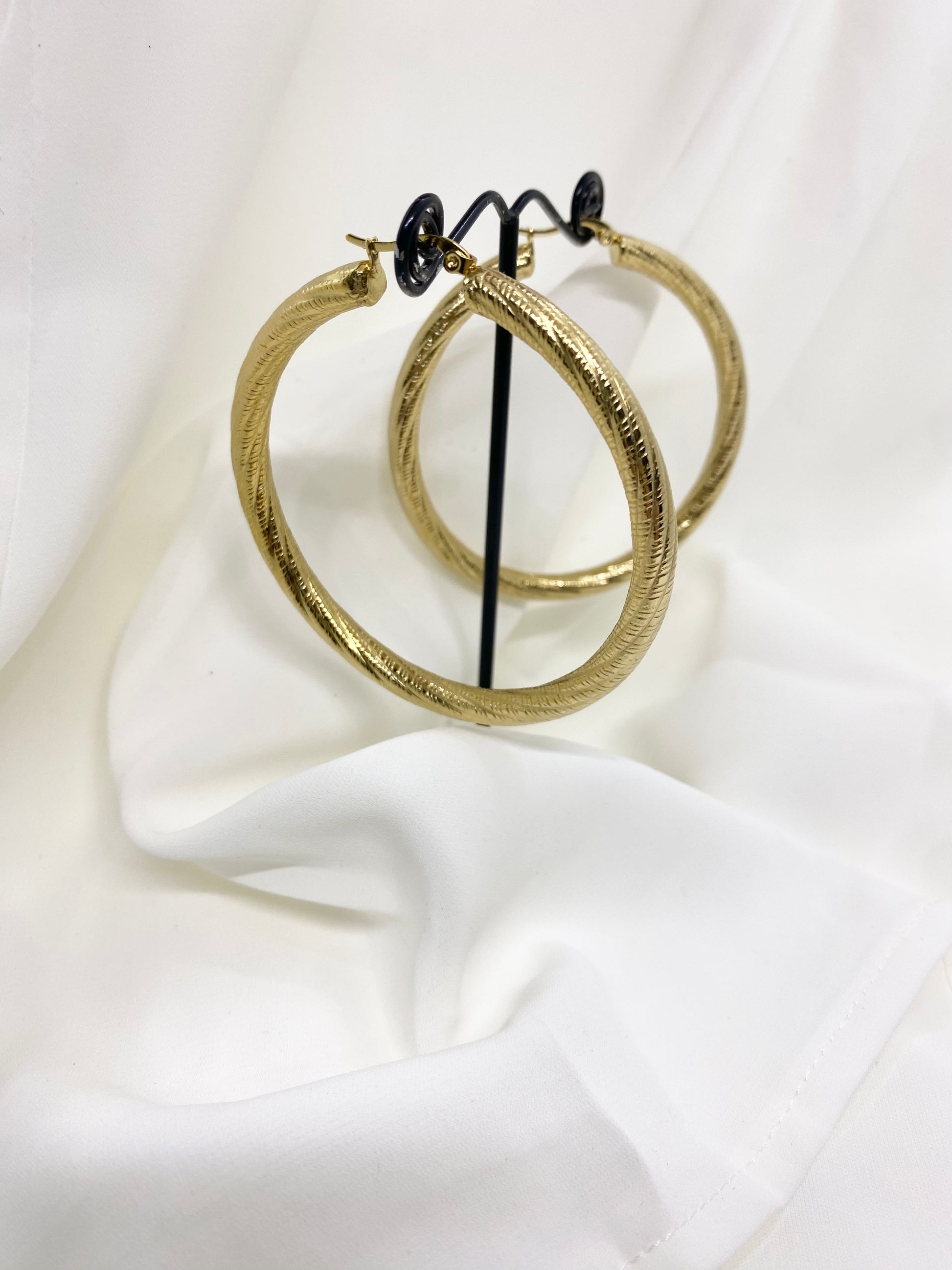 Éclat sophistiqué avec cette paire de grandes créoles dorées délicatement ciselées pour une touche de raffinement. Des boucles d'oreilles audacieuses, l'accessoire parfait pour une allure élégante et moderne.