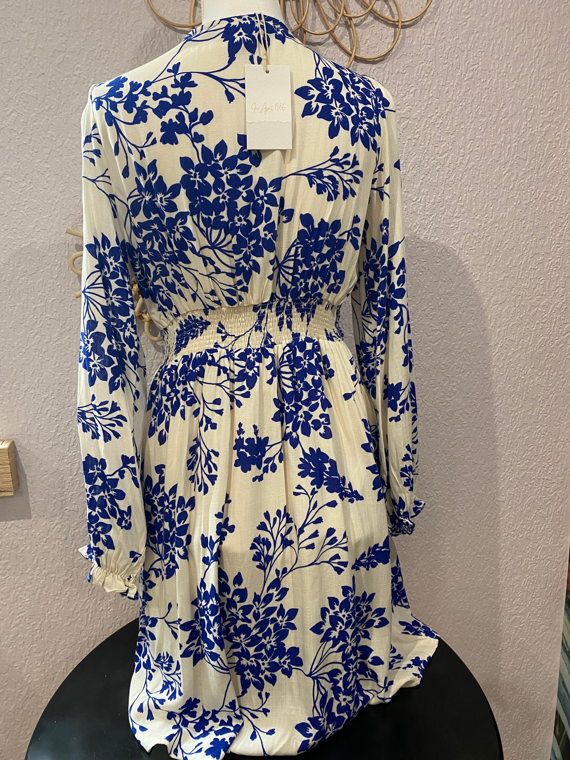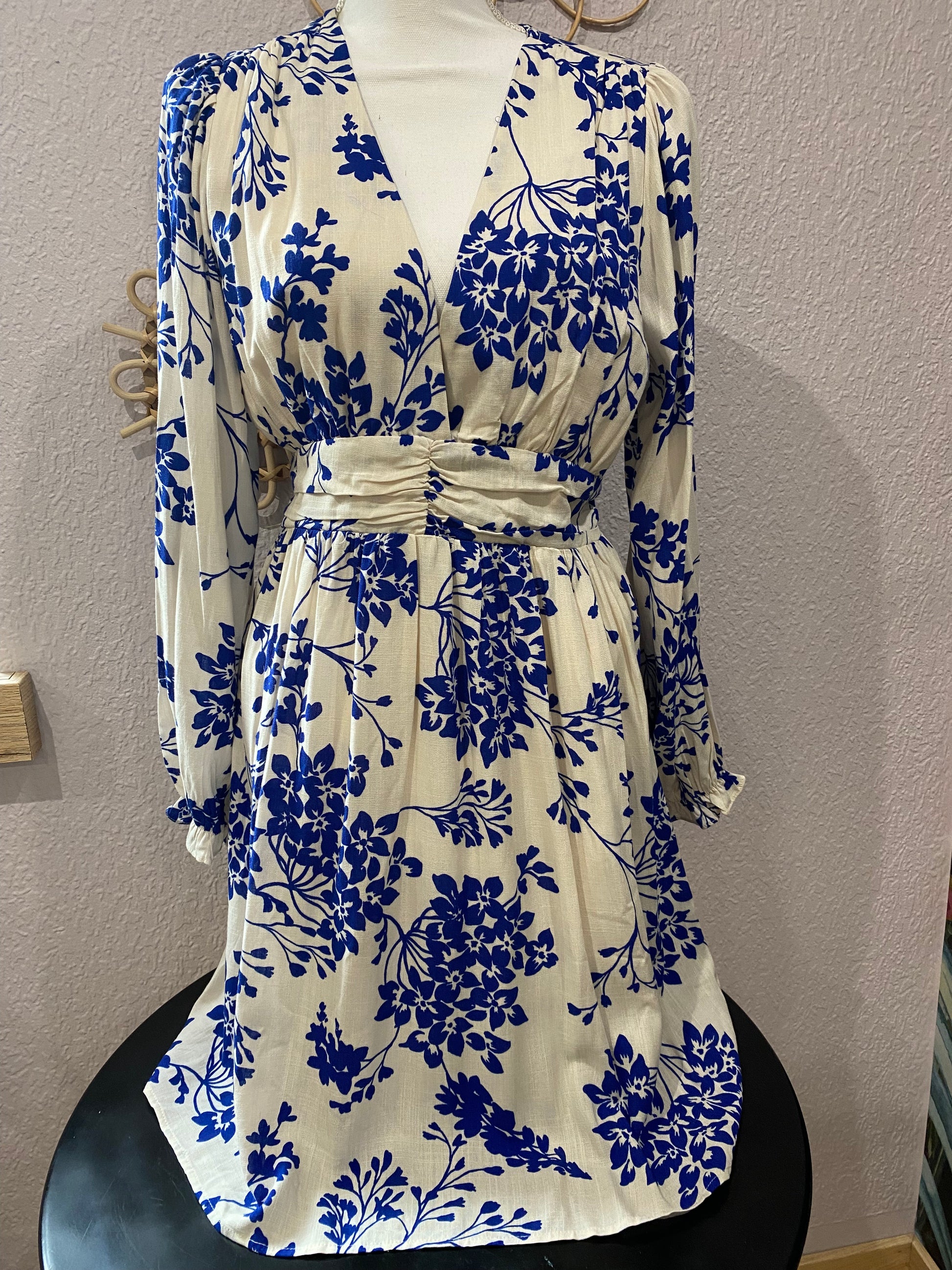 Détails : taille marquée, fronces sous la poitrine, imprimé floral bleu cobalt