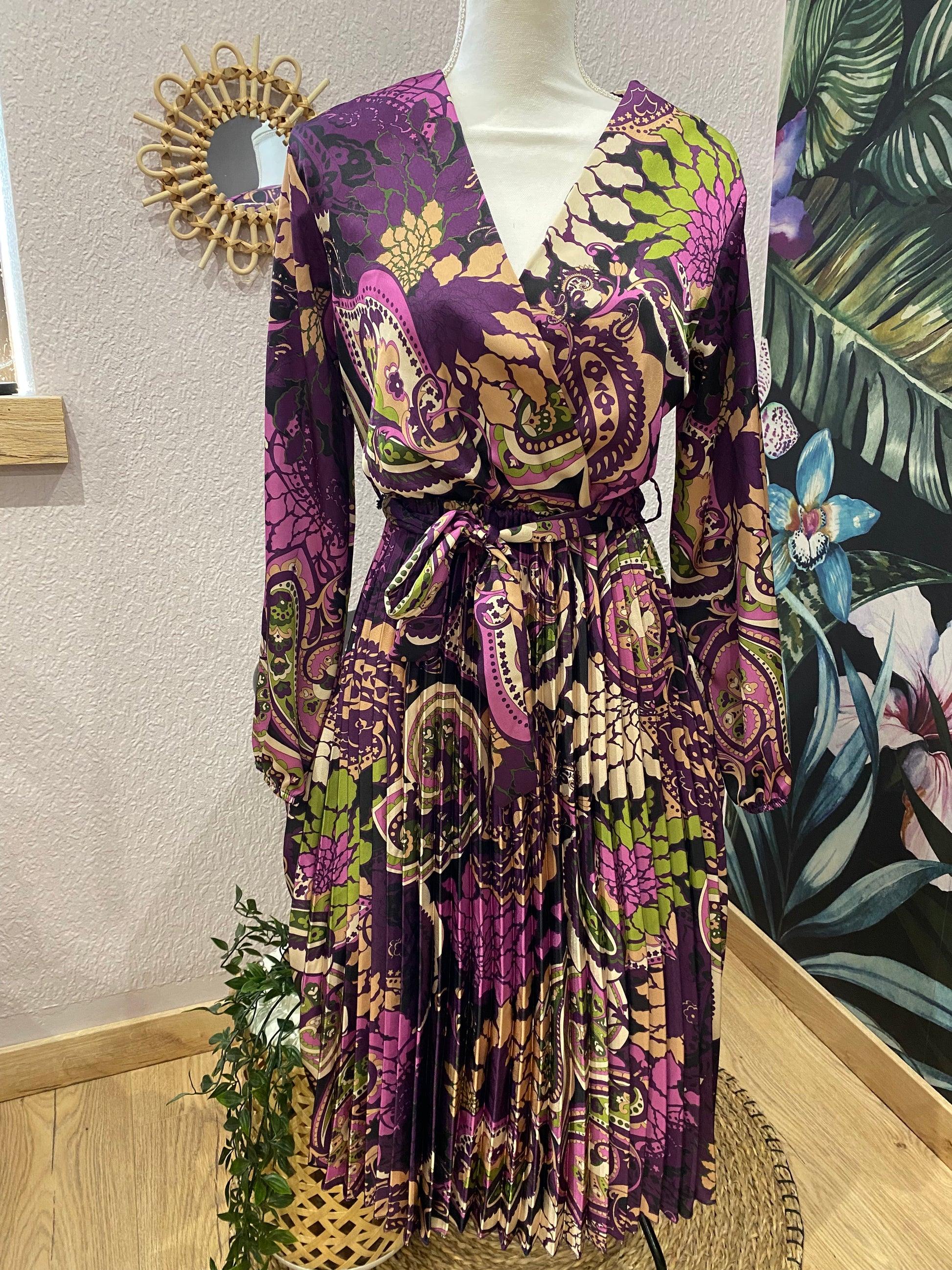 Cette robe seconde main séduit par son imprimé baroque audacieux et ses teintes profondes de violet, vert olive, beige et noir. Sa coupe portefeuille flatte la silhouette, tandis que le bas plissé lui apporte un superbe mouvement. Idéale pour une occasion chic ou pour dynamiser une tenue de tous les jours avec style.