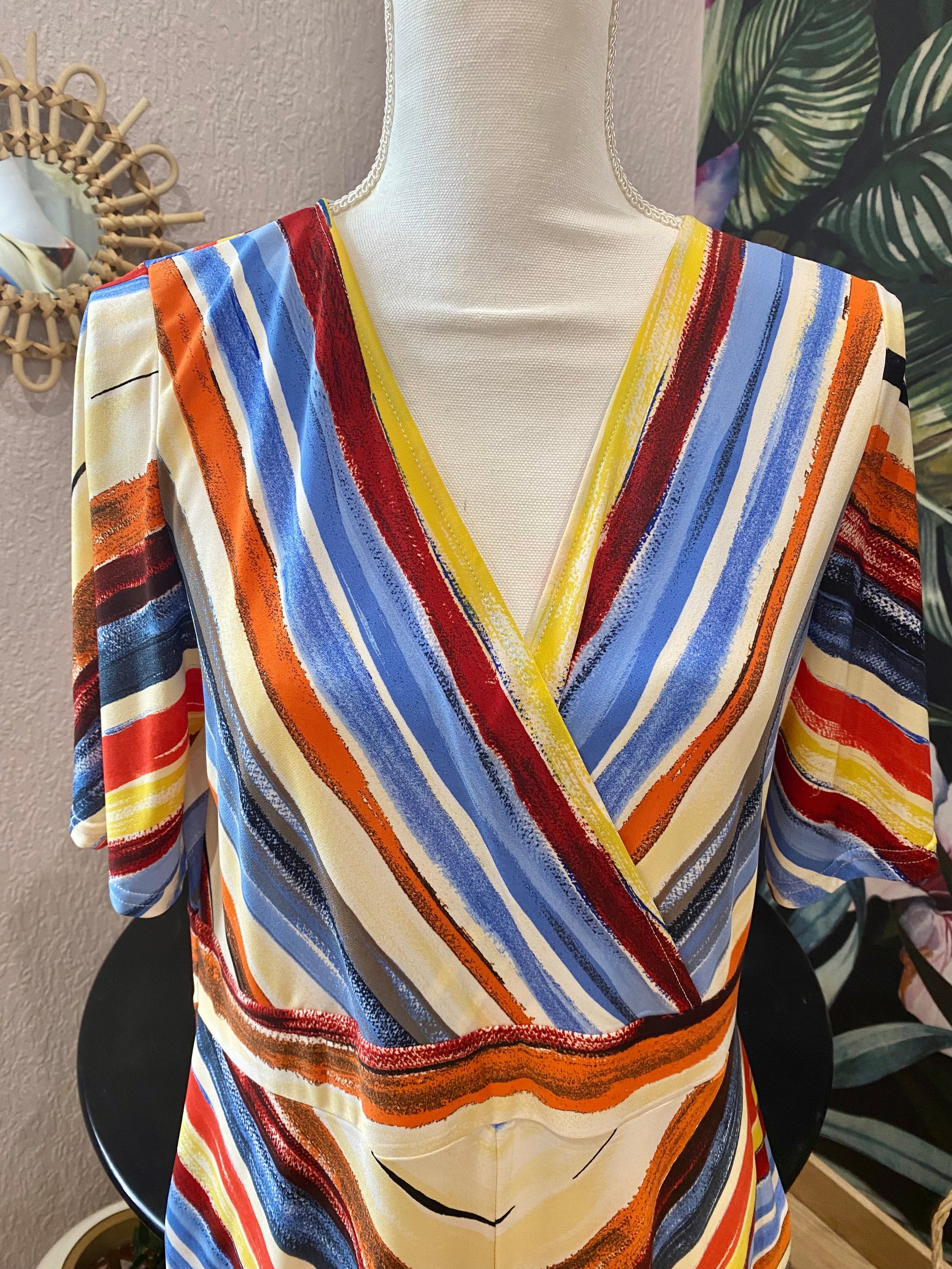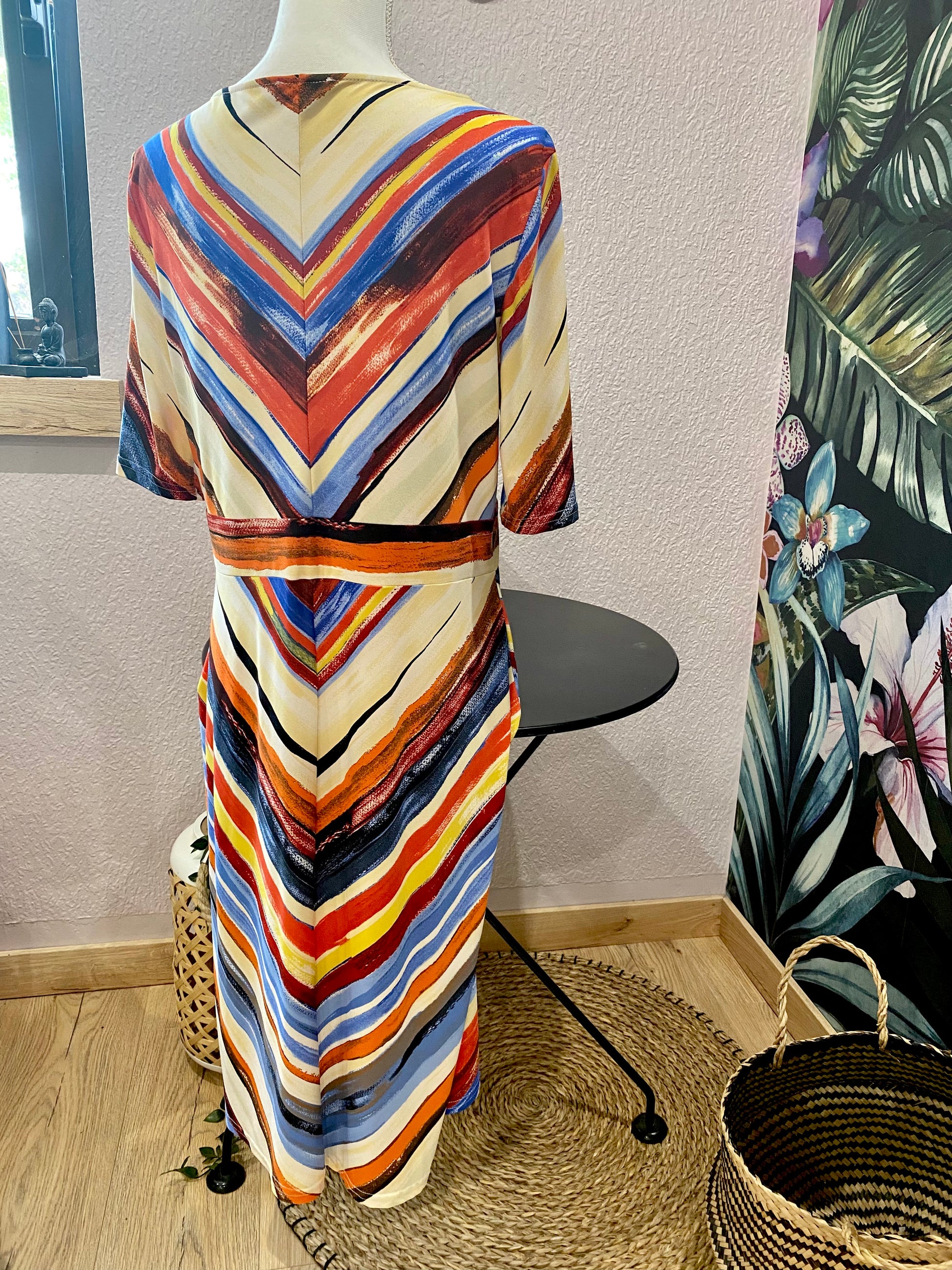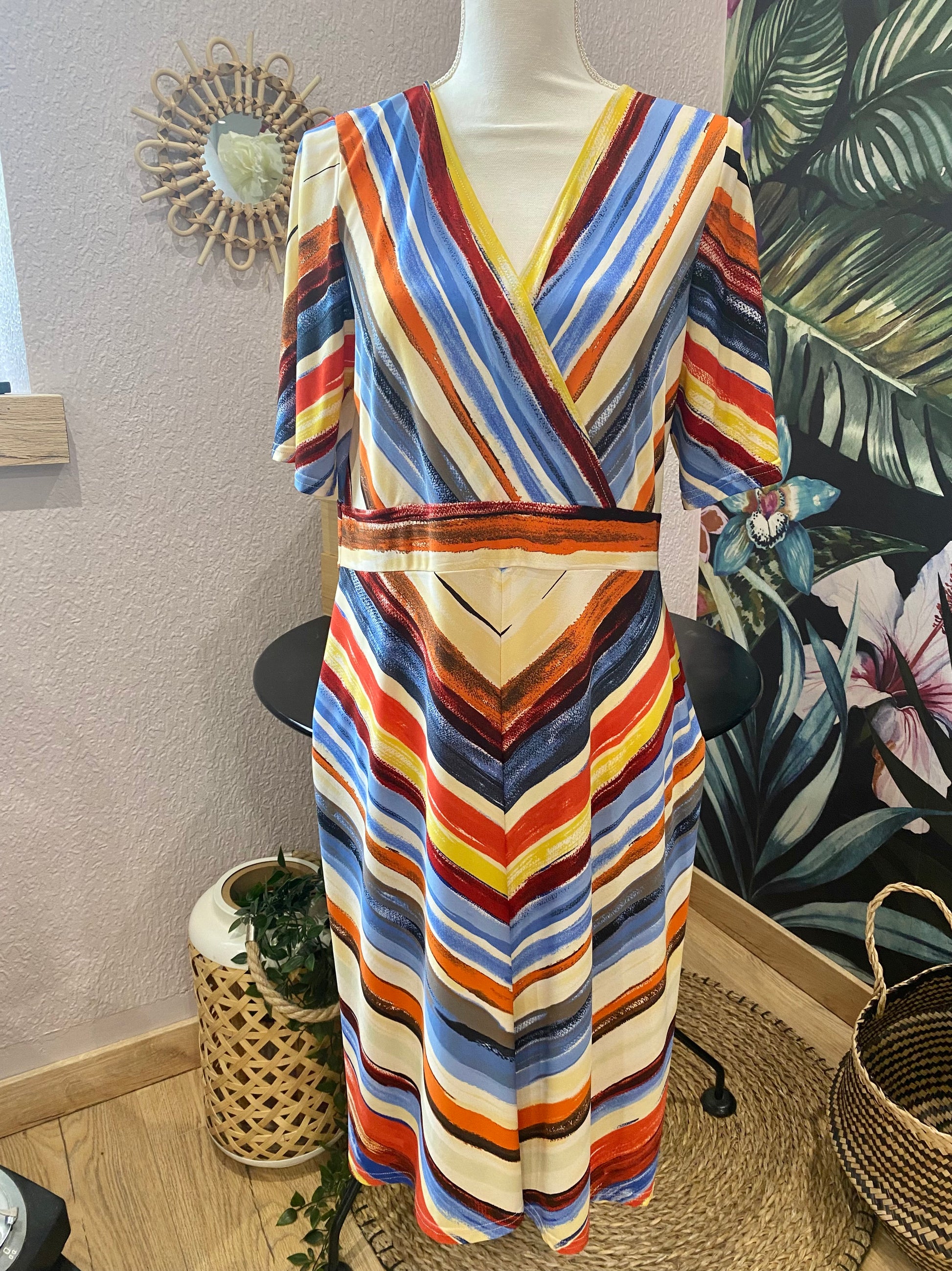 Cette robe "BRÉAL" seconde main à rayures multicolores séduit par son style à la fois joyeux et élégant. Avec sa coupe portefeuille et son tissu fluide d'un grand confort, elle est parfaite pour illuminer vos journée d'été ou vos soirée colorée.