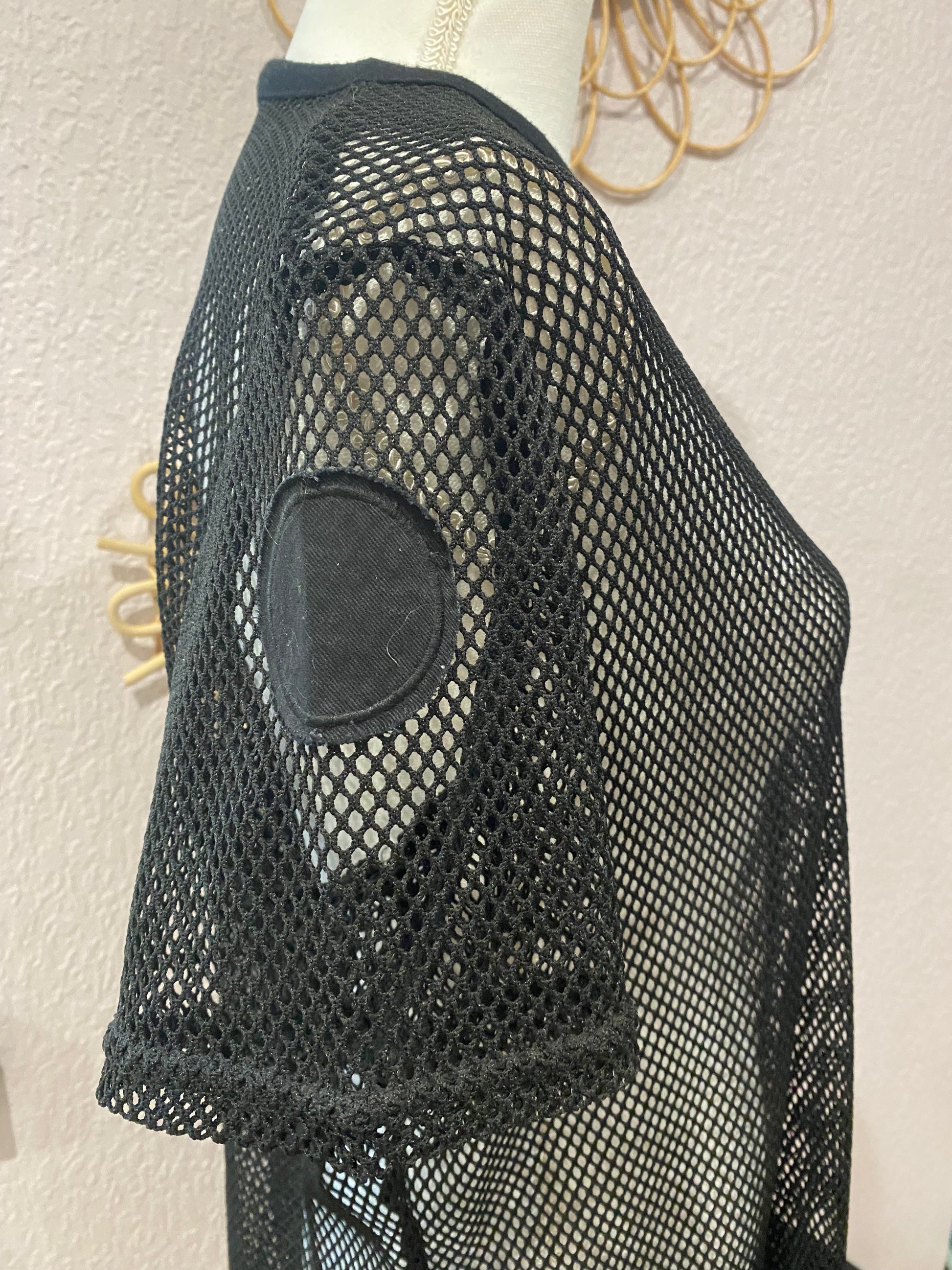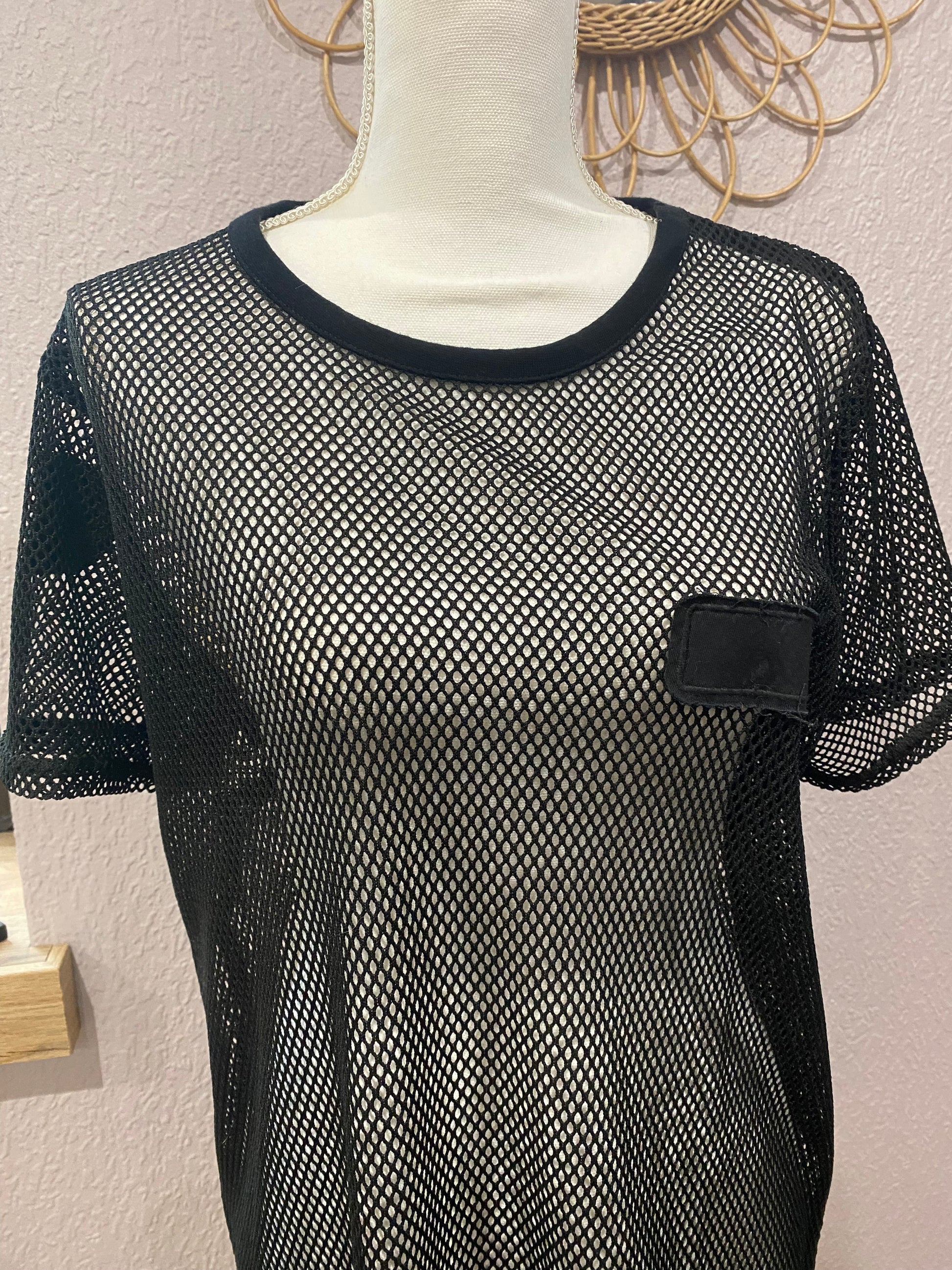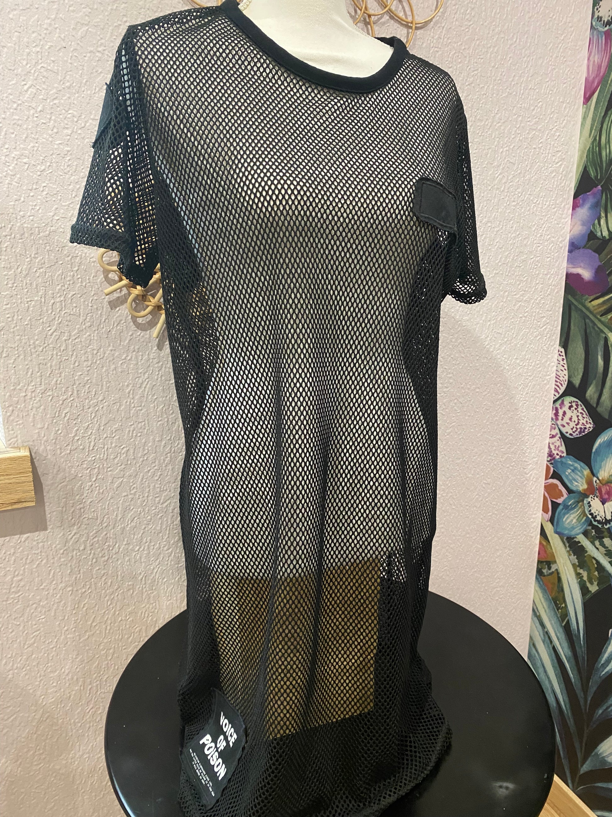 Cette robe t-shirt seconde main en résille noire offre un style streetwear affirmé et tendance. Portée sur un body ou un ensemble assorti, elle se transforme en pièce forte idéale pour les festivals, les looks layering ou une touche grunge assumée.