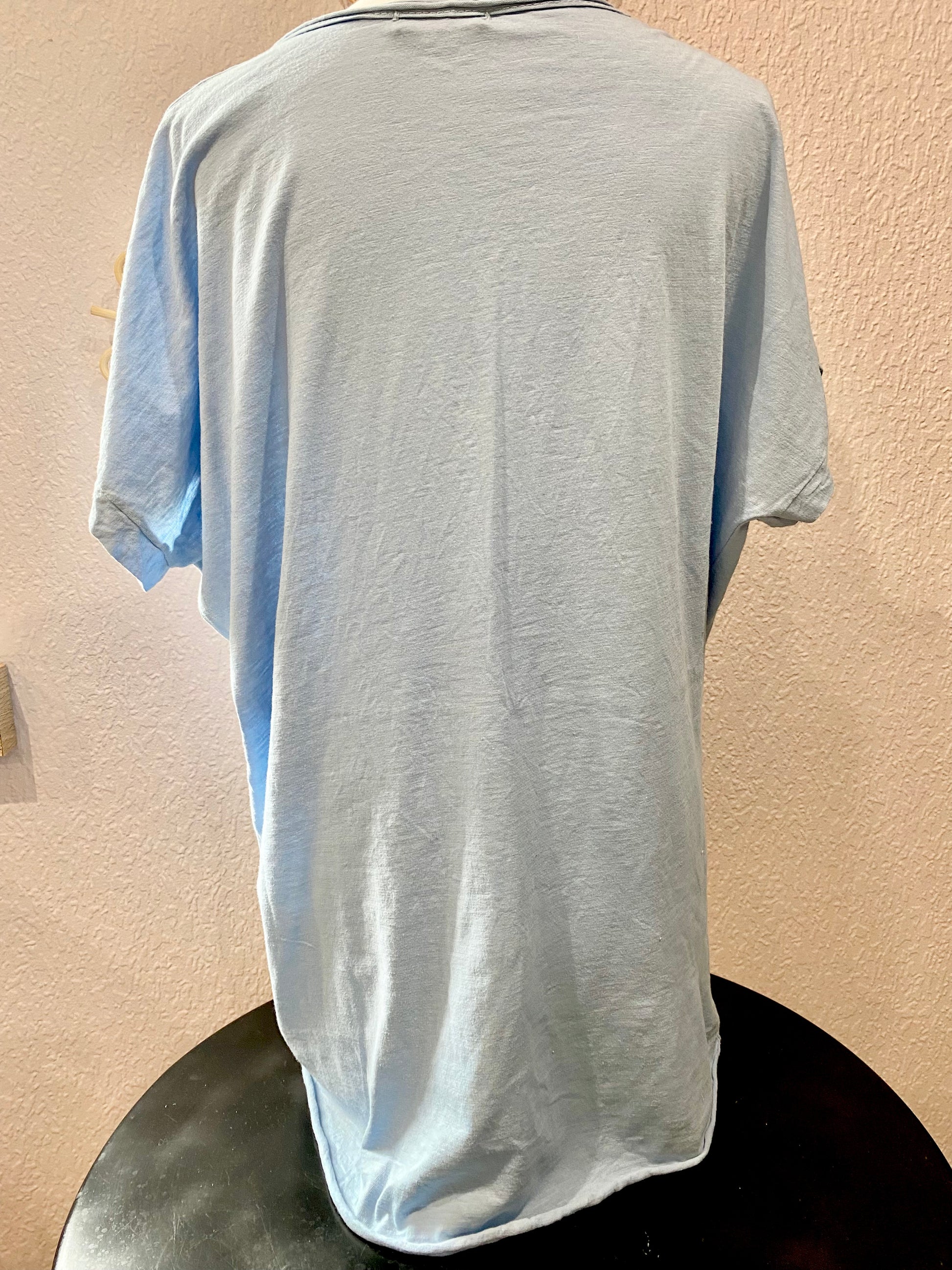 Ce t-shirt seconde main en coton bleu offre un look rock et tendance avec son imprimé têtebde mort rehaussé de touches de rose, idéal pour une allure casual au caractère affirmé. Facile à associer à un jean ou un short pour un style décontracté.
