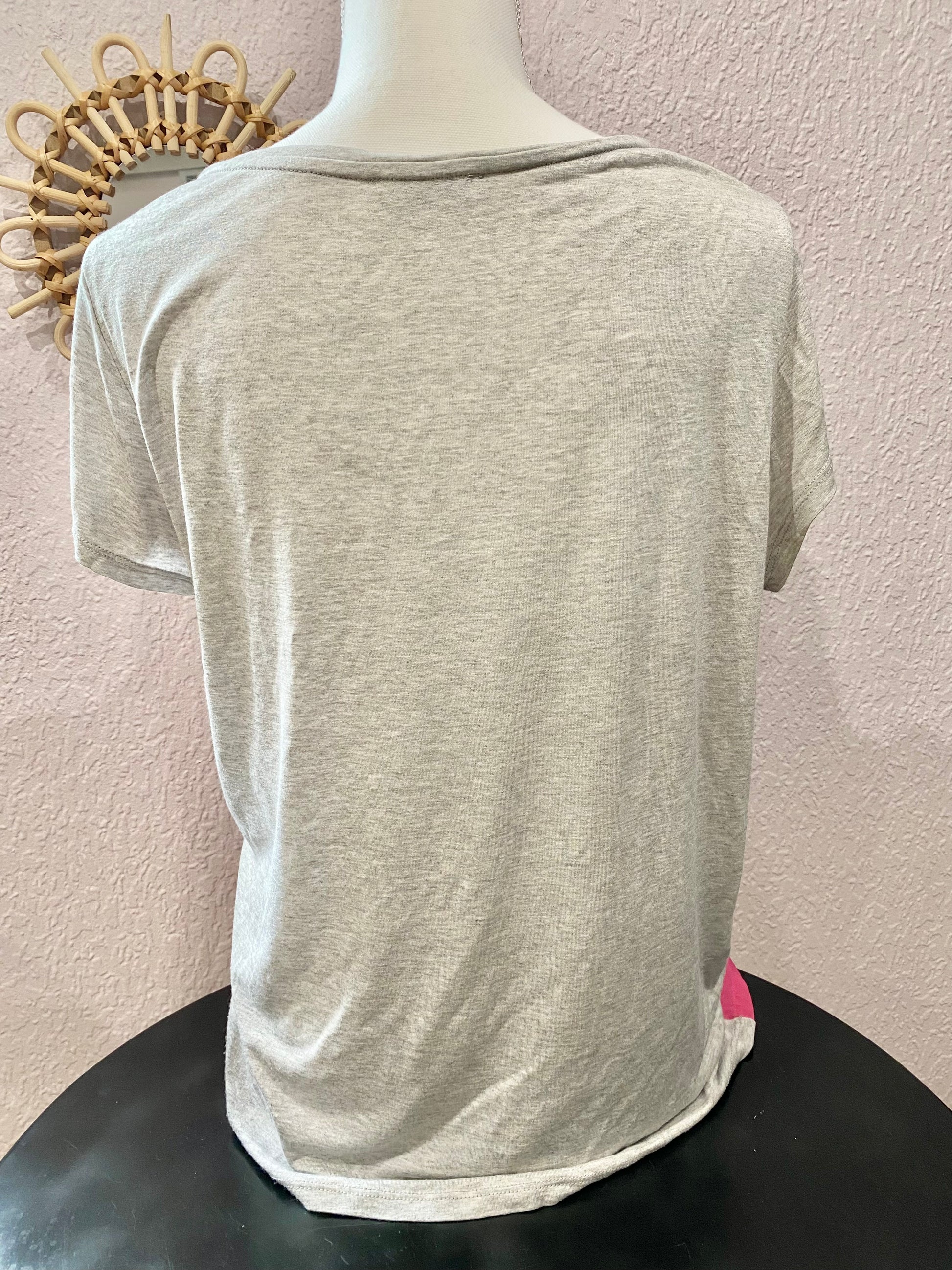 Ce t-shirt seconde main "PROMOD" aux accents exotiques séduit par son imprimé floral hawaïen et son message "Aloha Molokaï Forever". Son mélange de deux matière et couleur, rose vif en polyester sur l'avant et le dos en coton gris clair en fait une pièce idéale pour un look estival et décontracté.